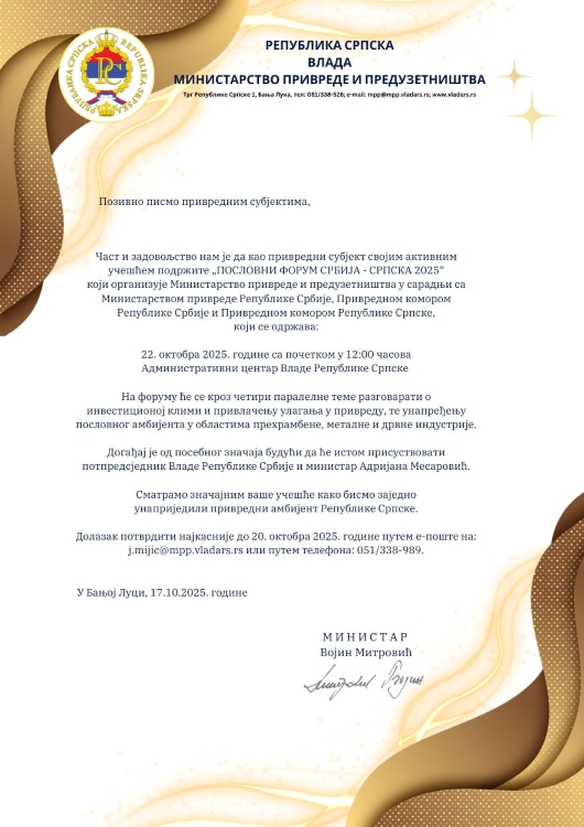 Ministarstvo privrede i preduzetništva ažurirano: 17 Oktobra, 2025 “POSLOVNI FORUM SRBIJA – SRPSKA 2025” By admin 17 Oktobra, 2025 0 0 Dijeliti FacebookTwitterPinterestVKWhatsApp Ne propustite Ministarstvo pravdeivana - 15 Januara, 2026Ministar Selak na božićnom prijemu u Istočnom Sarajevu Ministarstvo za naučnotehnološki razvoj i visoko obrazovanjeivana - 15 Januara, 2026Objavljeni rezultati konkursa za sufinansiranje programa i projekata studentskih organizacija za 2025. godinu Ministarstvo pravdeivana - 14 Januara, 2026Jednostavnijim postupkom registracije poslovnih subjekata do bolje investicione klime adminhttps://glasnik.org Dijeliti FacebookTwitterPinterestVKWhatsApp Prethodni članakObavještenje o prijemu zahtjeva za prethodnu procjenu uticaja na životnu sredinu za projekat sistema za osnježavanje ski staza u OC „Jahorina“ a.d. Pale – IV fazaNaredni članakMinistar Vojin Mitrović u radnoj posjeti Zvorniku - Advertisement - OSTAVITI ODGOVOR Odustati od odgovora Komentar: Molimo unesite komentar! Ime:* Ovdje unesite svoje ime E-mail:* Uneli ste neispravnu adresu e-pošte! Ovdje unesite svoju adresu e-pošte Website: Spremite moje ime, e-mail i web stranicu u ovom pregledniku sljedeći put kada komentarirate. Posljednje Ministarstvo pravdeivana - 15 Januara, 2026Ministar Selak na božićnom prijemu u Istočnom SarajevuMinistar pravde Republike Srpske Goran Selak prisustvovao je večeras, u Administrativnom centru Vlade Republike Srpske u Istočnom Sarajevu, božićnom... Ministarstvo za naučnotehnološki razvoj i visoko obrazovanje Objavljeni rezultati konkursa za sufinansiranje programa i projekata studentskih organizacija za 2025. godinu ivana - 15 Januara, 2026 Ministarstvo pravde Jednostavnijim postupkom registracije poslovnih subjekata do bolje investicione klime ivana - 14 Januara, 2026 Ministarstvo energetike i rudarstva Đokić: Narednog četvrtka će biti izvršeno ustupanje ugovora o koncesiji preduzeću RiTE „Ugljevik“ ivana - 13 Januara, 2026 Ministarstvo za prostorno uređenje, građevinarstvo i ekologiju Obavještenje o prijemu zahtjeva za prethodnu procjenu uticaja na životnu sredinu za projekat izgradnje farme za tov pilića, kapaciteta 20 000 komada po turnusu,... ivana - 12 Januara, 2026 Slične novosti Obustavlja se postupak dodjele podsticaja za povećanje plata radnika Ministarstvo privrede i preduzetništva ivana - 31 Decembra, 2025 Poziv na dostavu komentara i sugestija na Strategiju razvoja društvenog preduzetništva Republike Srpske za period 2025-2031 Ministarstvo privrede i preduzetništva admin - 7 Novembra, 2025 Donesena Uredba o dodjeli podsticaja za investicije od posebnog značaja Ministarstvo privrede i preduzetništva admin - 6 Novembra, 2025 Usvojen Prijedlog zakona o izmjenama i dopunama Zakona o razvoju malih i srednjih preduzeća Ministarstvo privrede i preduzetništva admin - 6 Novembra, 2025